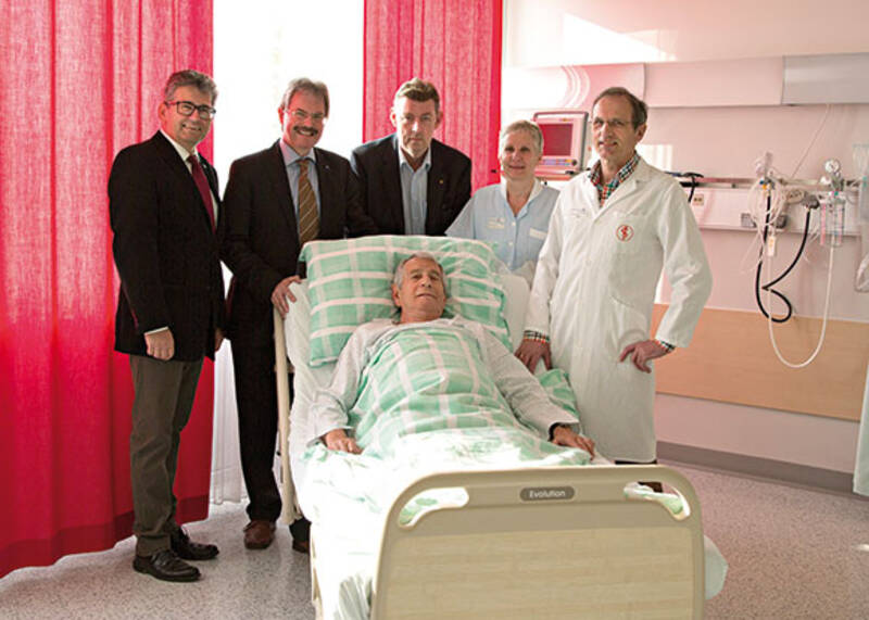 Manfred Scharmitzer aus Gänserndorf war der 500ste Patient, der im Medizinischen Zentrum Gänserndorf eine Katarakt-Operation erhielt, davor besuchten ihn noch Pflegedirektor DGKP Josef L. Strobl, akad. PD, Landesrat Mag. Karl Wilfing, der medizinische Standortleiter des MZG, Prim. Dr. Wolfgang Pichler, MAS, Stationsleitung DGKS Sylvia Köllner und Prim. Dr. Erich Urbanetz (v.l.). Copyright: auslösen-scharfstellen – Veronika Rath