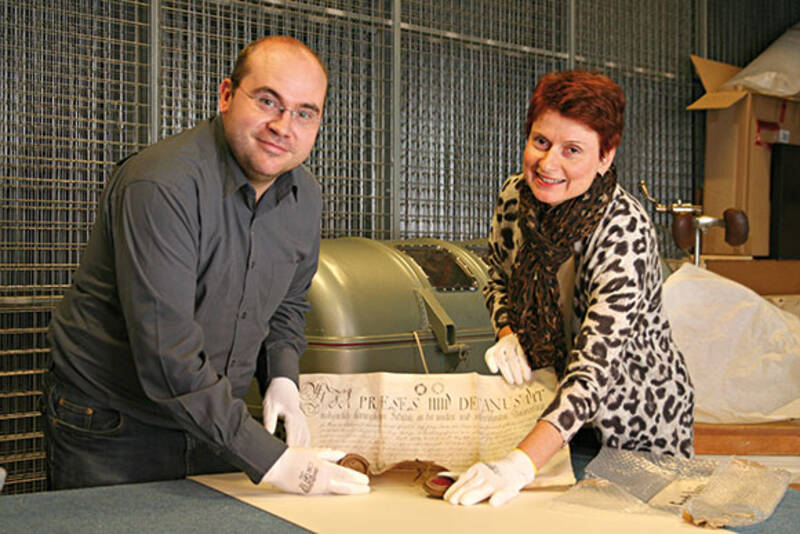 Dr. Johannes Kritzl und Martina Bertl vom NÖ Landesmuseum zeigen eine „Eiserne Lunge“ und eine Approbation aus dem Jahr 1831.