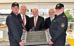 (v. l.) Lars Hintenberger, Bürgermeister Dr. Reinhard Resch, Landeshauptmann Dr. Erwin Pröll, Rektor Univ.-Prof. Dr. Rudolf Mallinger und Roland Hintenberger legten den Grundstein für die Karl Landsteiner Privatuniversität für Gesundheitswissenschaften am Campus Krems. FOT0: NÖ Landespressedienst/Burchhart