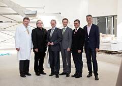 Bei der Besichtigung des Neubaus des Landesklinikums Mistelbach-Gänserndorf: (v.l.) Ärztlicher Direktor Prim. Univ.-Doz. Dr. Traindl, Kaufmännischer Direktor Dipl. KH-BW Josef Kober, Landesrat Mag. Karl Wilfing, Regionalmanager Weinviertel DI Jürgen Tiefenbacher, Pflegedirektor DGKP Josef L. Strobl, akad. PD, und VAMED-Projektleiter DI Stefan Zeillinger