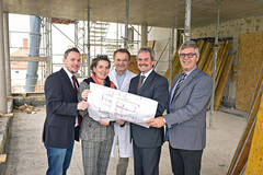 Die Fortschritte des Neubaus begutachteten (v.l.) Michael Hoffmann (Abteilung Bau und Facility Management der NÖ Landeskliniken-Holding), Pflegedirektorin Christa Grosz, MBA, der Ärztliche Direktor Prim. Univ.-Prof. Dr. Peter Schnider, Landesrat Mag. Karl Wilfing und der Kaufmännische Direktor Dipl. KH-BW Ferdinand Zecha.