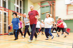 Dr.-Theodor-Körner-Hauptschule in St. Pölten etwas für ihre körperliche Fitness tun. Jeden Donnerstagnachmittag trainieren ältere Menschen 90 Minuten lang Kraft, Beweglichkeit, Gleichgewicht und Koordination. Begonnen wird mit flottem Gehen, wer will, kann laufen. Ingolf Wöll, der selbst 75 Jahre ist und lange als Sportlehrer Erfahrung gesammelt hat, leitet die Turnenden an und motiviert. „Jeder macht es so, wie’s ihm gut tut“, sagt Wöll immer wieder übers Mikrofon und fordert auf, beim Gehen imaginäre Äpfel aufzuheben. Für die nächste Übung bleiben alle stehen, strecken die Arme nach vorne und beugen die Knie. Die Stimmung ist konzentriert. Wer es schafft, macht zehn Kniebeugen. „Nicht zu ehrgeizig sein! Nicht in eine Schmerzzone hineinarbeiten!“ Da die Turnenden ganz unterschiedlich trainiert sind und die Altersbandbreite sehr groß ist – zwischen 60 und 90 Jahren –, betont Wöll, dass jeder gut auf sich achten muss. Und weil manche sehr ehrgeizig sind, wiederholt er fast wie ein Mantra, wie wichtig es ist, gut in den eigenen Körper hinein zu horchen.
