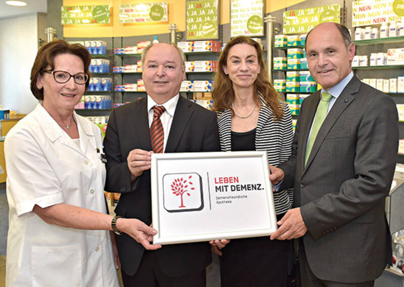 Das neue Logo der demenzfreundlichen Apotheken präsentierten: (v. l.) Mag. Susanne Maiwald (Rosenapotheke St. Pölten), Mag. Heinz Haberfeld (Präsident NÖ Apothekerkammer), Univ.-Prof. Stefanie Auer (Demenzforschung Donau-Uni Krems) und LH-Stv. Mag. Wolfgang Sobotka. Foto: NLK Filzwieser