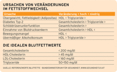 Fette und Fettbegleitstoffe wie Triglyceride und Cholesterin haben wichtige Aufgaben im menschlichen Körper und sind keineswegs nur „böse“. Cholesterin ist für den Aufbau der Zellmembranen wichtig, aber auch Basis von Steroidhormonen (z. B. Stress- oder Sexualhormone). Cholesterin kann im Körper selbst gebildet werden, so etwa in der Leber, und wird auch mit der Nahrung – über tierische Fette – aufgenommen. Cholesterinwerte können sich – je nach Lebenssituation – verändern, etwa wegen genetischer Veranlagung, bei Diabetes, im Alter oder bei Frauen nach der Menopause – in dieser Phase kann der Cholesterinspiegel erhöht sein. Ausschlaggebend ist der Anteil bzw. das Verhältnis von „gutem“ (HDL) und „schlechtem“ (LDL) Cholesterin. Ein erhöhter LDL-Wert begünstigt Gefäßverkalkungen (Atherosklerose) und stellt einen Risikofaktor für Herzerkrankungen und Schlaganfall dar. Der Anteil an HDL-Cholesterin sollte möglichst hoch sein, da es den Fettstoffwechsel bzw. den Abbau von Abfallprodukten fördert. Ein zu hoher HDL-Wert ist daher aus medizinischer Sicht nicht beunruhigend. Triglyceride werden großteils vom Körper selbst, in der Leber, gebildet, ein Teil davon wird über die Nahrung zugeführt. Triglyceride sind die Energielieferanten der Zellen, ein Zuviel wird als Fett gespeichert. Erhöhte Triglyceridwerte treten meist in Kombination mit erhöhten Cholesterinwerten auf und sind typische Begleiterscheinungen bei Diabetes und Übergewicht. Das erhöht das Risiko für kardiovaskuläre Ereignisse und Schlaganfall. Ein zu hoher Wert tritt nach üppigem Essen oder reichlich Alkoholkonsum auf.