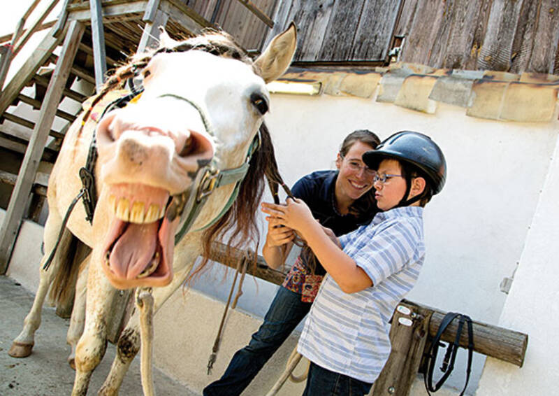 Lebensmut, richtige Lebensfreude liegt in der Luft, wenn der neunjährige Dominik und seine um ein Jahr ältere Schwester Melissa mit wachsender Ungeduld, den Reithelm schon in der Hand, auf Therapiepferd Jokki und seinen Kollegen Tamino warten. Kein bisschen sieht man den beiden in diesem Moment an, welch schweres Schicksal sie tragen. Ganz im Gegenteil: Als sie gemeinsam mit ihren Therapeutinnen die sanften Pferde aus dem geräumigen Laufstall am Lichtblickhof holen, strahlen die Kinder über das ganze Gesicht. Die speziell ausgebildeten Vierbeiner folgen jeder Bewegung von Dominik und Melissa mit vorsichtigen Schritten und stellen am Weg zum Putzplatz bedächtig einen Fuß vor den anderen. Auch als Laie spürt man, dass es sich hier um ganz besondere Tiere handelt – schon an der Ruhe und Sanftheit, die sie ausstrahlen. Gemeinsam werden die Pferde dann von den Kindern und ihren Betreuerinnen für die Reitstunde fertig gemacht. Zum Bürsten und Flechten der Mähne darf Dominik auf einen erhöhten Mauervorsprung klettern, von dort aus zaubert er konzentriert „seinem“ Jokki bunte Zöpfe in den langen, welligen Haarschopf. Therapeutin Dorothea, die Dominik seit mehreren Jahren begleitet, ist stolz auf ihren Schützling: „Viele Handlungen, die uns selbstverständlich erscheinen, sind für Kinder mit körperlichen Beeinträchtigungen eine große Herausforderung. Dass Dominik so selbstbewusst da oben steht, setzt viel
