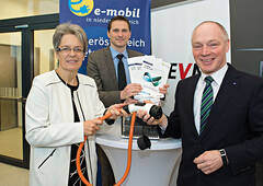 Freuen sich über das flächendeckende Netz von E-Ladestationen in Niederösterreich: (v. l.) Wirtschaftslandesrätin Dr. Petra Bohuslav, DI Oliver Danninger und ecoplus-Geschäftsführer Mag. Helmut Miernicki