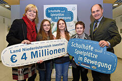 Um diese weiter auszubauen, läuft seit Herbst 2014 die Förderaktion „Schulhöfe und Spielplätze in Bewegung“ in Kooperation zwischen dem Land Niederösterreich, der NÖ Familienland GmbH und der Aktion „Natur im Garten“. Dabei werden Gemeinden in Niederösterreich bei der Schaffung von naturnahen, bedürfnisgerechten Schulfreiräumen und Spielplätzen unterstützt. Bis zu zwei Drittel der tatsächlich entstandenen Projektkosten werden gefördert. Die ersten 30 geförderten Gemeinden feierten im Jänner 2015 den Auftakt für ihre Projekte. Diese 20 Schulfreiräume und zehn Spielplätze befinden sich derzeit in der Bauphase und werden bis Juni 2016 eröffnet. Bis 11. Dezember können alle niederösterreichischen Gemeinden, Schulgemeinden und Gesellschaften im Alleineigentum niederösterreichischer Gemeinden einen Antrag für diese Förderung stellen.