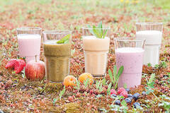 Idealerweise sollten Sie Ihren Smoothie sowieso frisch zubereiten – selbst gemacht schmeckt’s immer noch am besten, und so wissen Sie genau, was drin ist. Ob Beeren, Marillen, Äpfel, Karotten: Mixen Sie je nach Gusto Ihren Lieblings-Smoothie. Erlaubt ist, was schmeckt. Früchte waschen, bei Bedarf schälen und in kleine Stücke schneiden. Ob Sie das kleingeschnittene Obst nun mit einem Pürierstab oder einem Standmixer pürieren, kommt auf die Obstmenge an. Ist Ihr Smoothie zu dickflüssig oder breiig, können Sie ihn mit etwas Wasser oder Milch verdünnen. Seien Sie kreativ und