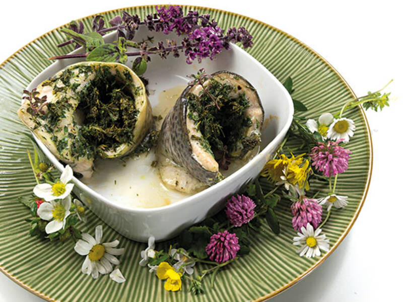 Zutaten: 4 Forellenfilets, 4 EL Kräuter (z. B. Brennnessel, Dille, Kresse), 1 EL Rapsöl, 2 Häferl (Vollkorn-)Couscous, 2 TL Butter, 1 unbehandelte Zitrone (Saft), Salz, Pfeffer