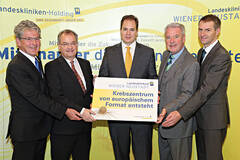 (v.l.) Der Ärztliche Direktor des Landesklinikums Wiener Neustadt Prim. Univ.-Doz. Dr. Paul Christian Hajek, Prim. Univ.-Prof. Dr. Edgar Selzer, Prim. Univ.-Prof. Dr. Wolfgang Köstler, PhD, Klubobmann Mag. Klaus Schneeberger und der Regionalmanager der Thermenregion DI Alfred Zens, MBA, von der NÖ Landeskliniken-Holding