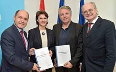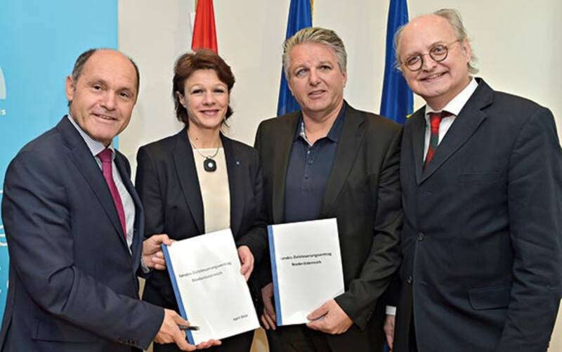 Einigten sich auf den Landeszielsteuerungsvertrag (v.l.) Mag. Wolfgang Sobotka (Landeshauptmann-Stellvertreter und Vorsitzender des NÖ Gesundheits- und Sozialfonds), Mag. Elfriede Riesinger (Geschäftsführerin des NÖGUS), KR Gerhard Hutter (Obmann der NÖ Gebietskrankenkasse), Mag. Jan Pazourek (Generaldirektor der NÖ Gebietskrankenkasse)
