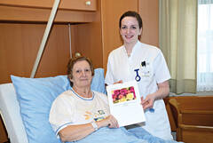 Im Landesklinikum Horn freut sich Patientin Edith Neuwirth über die elektronisch übermittelten Grüße, die ihr DGKS Eveline Eisner überbringt. FOTO: Gerald Lechner