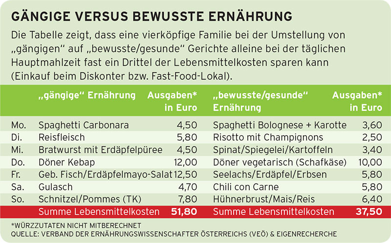 Die Tabelle (s. oben) zeigt, dass eine vierköpfige Familie bei der Umstellung von „gängigen“ auf „bewusste/gesunde“ Gerichte alleine bei der täglichen Hauptmahlzeit fast ein Drittel der Lebensmittelkosten sparen kann (Einkauf beim Diskonter bzw. Fast-Food-Lokal).