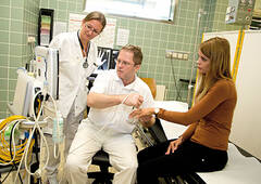 Nach der letzten Operation für heute begutachtet Hausner die Patienten in der Ambulanz, es herrscht reger Betrieb. Patientin Maria N. hält ihm ihren linken Zeigefinger entgegen, er ist angeschwollen und schmerzt. Nach dem Handultraschall steht fest: Eine Verkalkung ist Schuld an den Beschwerden, nichts Bösartiges. Der Handexperte entscheidet sich für eine konservative Behandlungsmethode, eine Stoßwellentherapie, die im Nebenraum gleich von Assistenzärztin Dr. Sabine Minar-Jurasz durchgeführt wird. Mit einem speziellen Gerät werden nun hydroenergetische Schallwellen in die betroffene Stelle eingebracht. „Danach gibt’s noch eine Schiene für eine Woche, dann sollten die Beschwerden behoben sein“, erklärt Hausner der Patientin.