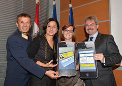 (v.l.) Landespolizeikommandant-Stellvertreter Franz Popp, Innenministerin Mag. Johanna Mikl-Leitner, Carina Mader (Jugendinfo NÖ) und Jugendlandesrat Mag. Karl Wilfing präsentieren die NÖ Jugend-App.