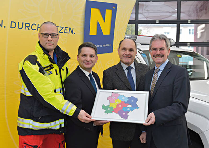 Die Notarztversorgung für Nieder-österreich wird neu ausgeschrieben. Bei der Präsentation: (v. l.) Notarzt OA Dr. Christian Fohringer (Klinische Abteilung für Anästhesie und Intensivmedizin des Uniklinikums St. Pölten), Landesrat Ing. Maurice Androsch, LH-Stv. Mag. Wolfgang Sobotka und Landesrat Mag. Karl Wilfing