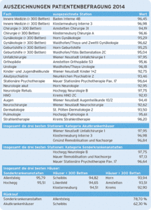 Fächer an 25 Standorten beurteilt. Die Auswertung der rund 60.000 Fragebögen zeigt: Die Patienten sind mit den Angeboten und den Leistungen in den NÖ Landes- und Universitätskliniken sehr zufrieden. Sowohl das Ärzteteam (94,11 Punkte) als auch das Pflegepersonal (95,71 Punkte) kamen dem maximalen Wert von 100 sehr nahe. „Diese Zufriedenheit verdanken wir in erster Linie unseren Mitarbeiterinnen und Mitarbeitern, die ihrer Arbeit beherzt nachgehen“, freut sich Landesrat Mag. Karl Wilfing und nahm dies gemeinsam mit der NÖ Landeskliniken-Holding zum Anlass, um den am besten bewerteten Stationen Dank und Anerkennung auszusprechen und ihnen eine Urkunde zu überreichen. In den folgenden Kategorien wurden Urkunden vergeben: