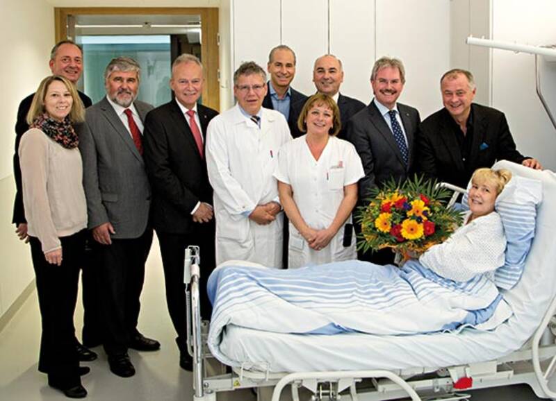 Pavillon A am Standort Mödling in Betrieb: (v.l.) DGKS Katja Sacher, BSc (interim. stv. Pflegedirektorin), Dipl. KH-BW Nikolaus Jorda (stv. Kaufmännischer Direktor), Dr. Robert Griessner (Medizinischer Geschäftsführer NÖ Landeskliniken-Holding), Dipl. KH-BW Reinhard Fritz (Kaufmännischer Direktor), Prim. Dr. Burghard Plainer (stv. Ärztlicher Direktor), Prim. Univ.-Prof. DDr. Thomas Klestil (Vorstand der Abteilung für Unfallchirurgie), DGKS Maria Ambrosch (Stationsleitung Unfallchirurgie Bettenstation), Prim. Univ.-Doz. Dr. Johann Pidlich (Ärztlicher Direktor LK Baden-Mödling), Landesrat Mag. Karl Wilfing, Bürgermeister LAbg. Hans Stefan Hintner mit Patientin Manuela Sindler