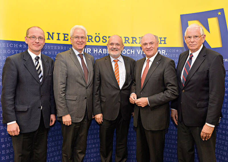 (v.l.) Rektor Mag. Friedrich Faulhammer (Donau-Universität Krems), Rektor Univ.-Prof. Dr. Wolfgang Schütz (Medizinische Universität Wien), Rektor Univ.-Prof. Dr. Rudolf Mallinger (Karl Landsteiner Privatuniversität für Gesundheitswissenschaften), Landeshauptmann Dr. Erwin Pröll und Prof. Dr. Heinz Boyer (IMC FH Krems)