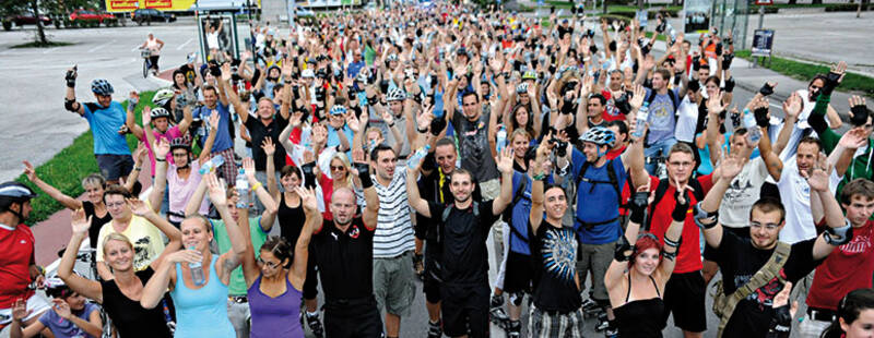Begleitet von der Exekutive und peppiger Musik ziehen Skaterinnen und Skater über gesperrte Straßen durch Wiener Neustadt und St. Pölten.