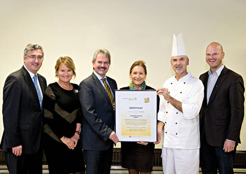 Präsentieren stolz das »Vitalküche«-Zertifikat im Landesklinikum Krems: Der Ärztliche Direktor Prim. Dr. Heinz Jünger, Pflegedirektorin Siegrun Karner, akad. Pflegemanagerin, Landesrat Mag. Karl Wilfing, Gesundheitskoordinatorin Mag. Inge Bauer, Küchenleiter Robert Steiner und der Kaufmännische Direktor DI Franz Laback, MBA. FOTO: Felicitas Matern