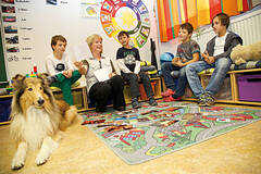 Nach zahlreichen Fütterungsversuchen und vielen Sitz-, Platz- und Komm-Kommandos braucht Whoopy eine Pause, und Felicitas Grübl setzt sich mit den Schülern im Kreis auf. Sie zeigt Bilder von verschiedenen Hunderassen und fragt in die Runde, um welche Rasse es sich handelt. Dackel, Mops und Dalmatiner werden genannt, Grübl bestätigt, lobt oder korrigiert. Die Kinder sind aufmerksam und interessiert. „Es ist wissenschaftlich nachgewiesen, dass Kinder bei der Arbeit mit den Tieren ruhiger, ausgeglichener und konzentrierter werden. Anschließend kann man gut mit ihnen arbeiten.“ Eine der Lehrerinnen der Sonderschule hat das nach der vergangenen tierpädagogischen Einheit erfahren: Sie konnte mit den Schülern eine Stunde lang in Ruhe basteln, was sonst fast nicht möglich ist.
