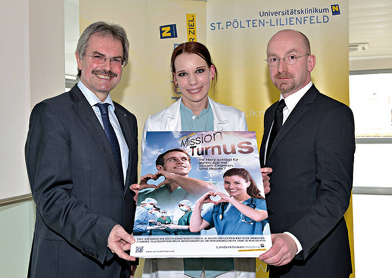(v.l.) Landesrat Mag. Karl Wilfing, Dr. Theresa Roiser (Turnusärztin im Uniklinikum St. Pölten) und Dr. Thomas Gamsjäger, MSc (Ärztlicher Direktor im Uniklinikum St. Pölten), präsentieren die neue Kampagne der NÖ Landeskliniken-Holding für die Werbung um Ärzte-Nachwuchs bei Mediziner-Messen: „Turnus mit Herz“.