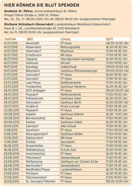 Jedes Jahr werden in Niederösterreichs Kliniken rund 63.000 Blutkonserven benötigt, um Menschenleben zu retten. Gerade im Sommer werden jedoch die Blutvorräte knapp. „Wir brauchen dringend junge Menschen, die Blut spenden, denn sie sind die Spender von morgen“, erklärt Landesrat Mag. Karl Wilfing. Daher ruft die NÖ Landeskliniken-Holding in Kooperation mit der NÖ Jugendinfo 1424 und der Rot Kreuz Blutbank für NÖ, Wien und das Burgenland jetzt junge Menschen ab 18 Jahren zum Blutspenden auf. Das Motto: „Eine Gruppe hAst du sch0n AB deiner GeBurt. Werde jetzt Teil einer neuen Gruppe“. Diese Blutspendeaktion findet von 16. Juli bis 30. August 2015 statt. Wer Blut gespendet hat, kann seine Erfahrung unter dem Hashtag #lifesaver_noe in den sozialen Medien verbreiten und damit auch andere motivieren. Als kleines Dankeschön für die Blutspende warten Geschenke wie Trinkflaschen oder Kühltaschen – sowie die Chance auf tolle Gewinne in Form von Tickets für coole Events. Außerdem bekommt die größte Spendergruppe eine eigene „lifesaver-noe-party“ mit toller Licht- und Tontechnik, DJ, Snacks und Getränken. Die Landjugend NÖ ist mit rund 19.000 Mitgliedern die größte überparteiliche Jugendorganisation im Land. Über verschiedene Kanäle werden nun auch deren Mitglieder zum Blutspenden animiert. Werden auch Sie zum „Lifesaver“!